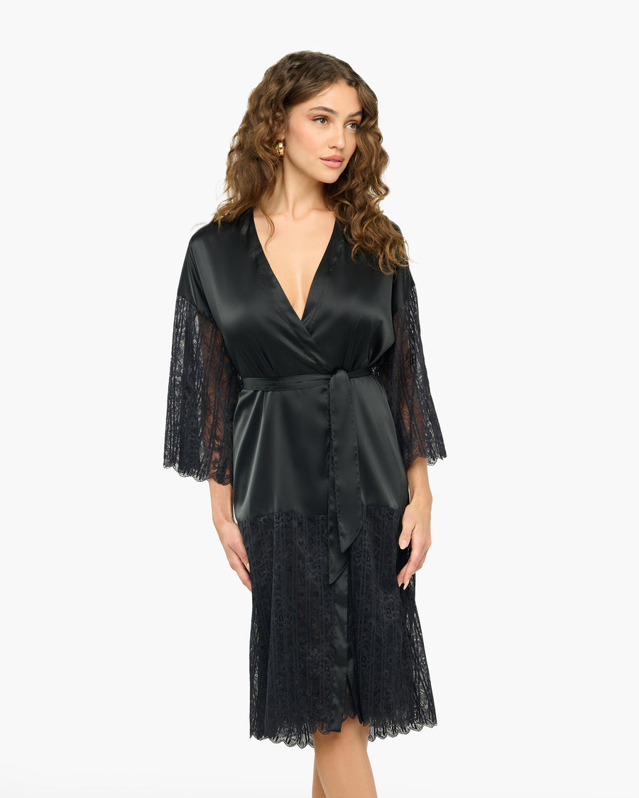 Capturing the allure of Venetian nights, this collection pairs striped stretch lace with lightweight satin for a look that’s both mysterious and refined. With delicate shimmer and flowing silhouettes, Misteriosa is designed for layering, lounging, and lingering a little longer. The Misteriosa Robe is lightweight and elegant—designed to drape effortlessly over your sleepwear to complete your night with quiet sophistication.